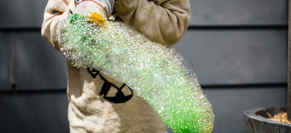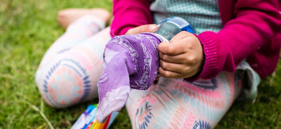 7. You can drip some drops of different food colouring on the sock end once you’ve dipped it in the detergent to make your colourful bubble worm.