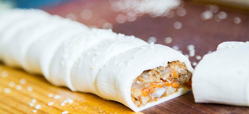 - Wet one side of the pastry, then carefully roll over the pastry and slightly press down. Diagonally make scores across the top with a sharp knife, brush or spray with oil and sprinkle with sesame seeds.