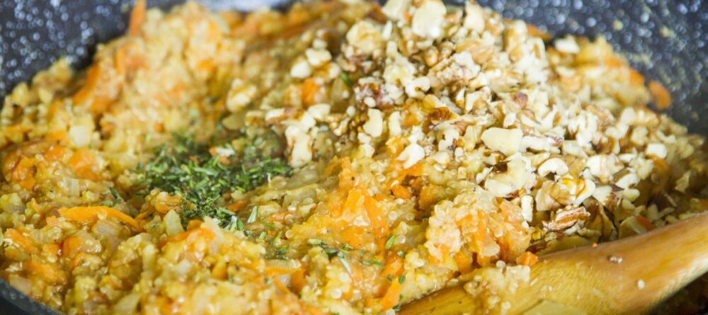 - Saute garlic and onion in olive oil for 3 minutes or until onions are softened. Stir through carrot, apple, quinoa, lentils, walnuts and tomato sauce.