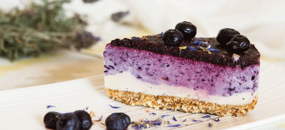 - TOP: blend blueberries into a berry sauce. Pour over the last layer and shake the tin to make the sauce sit evenly. Freeze for at least 4 hours.