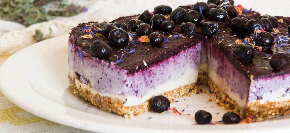 - FILLING: Blend all filling ingredients except blueberries and extra coconut oil until smooth. Spread half the mixture onto the base by placing big dollops and carefully smoothing it out. Pop into the freezer.