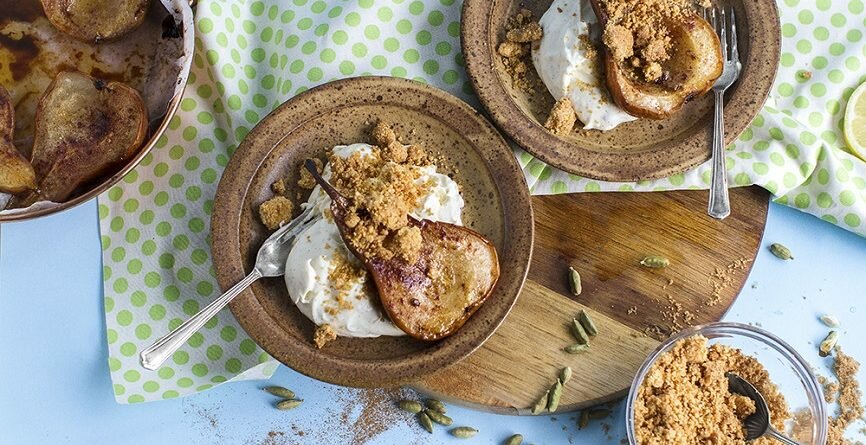 To serve, place a dollop of the mascarpone cream on your serving dish, top with a pear, and spoon over the cardamom crumbs.