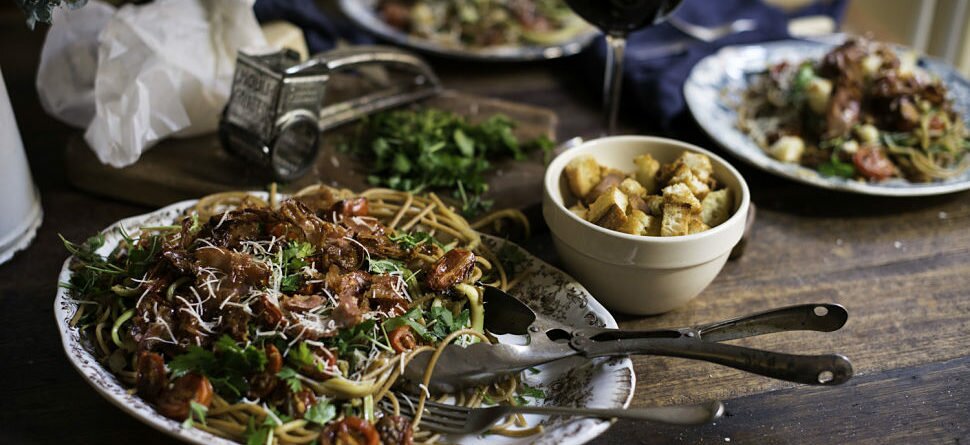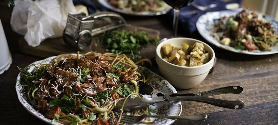 Serve pasta into a large serving platter and place zucchini mixture, parsley, roasted tomatoes and sprinkle the crispy pancetta over the top. Grate a healthy serve of Paremesan cheese over the top and serve with a good Chianti.